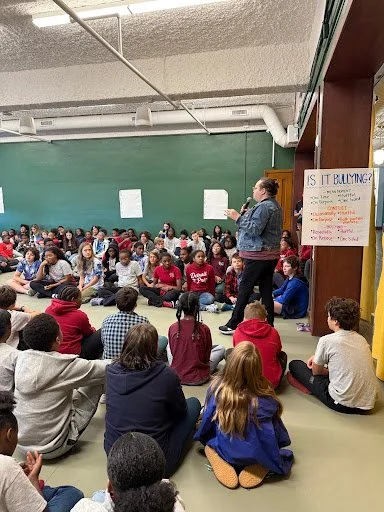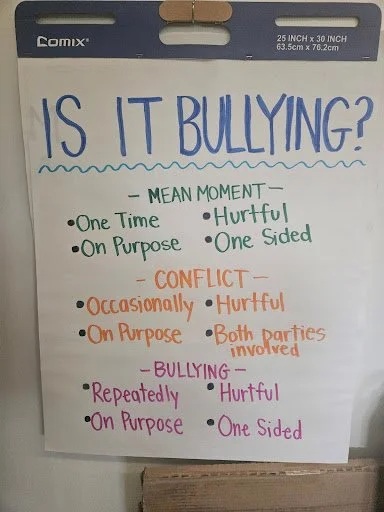 Throughout October, students in grades 2-8 engaged in weekly lessons around being an upstander. They began by learning the difference between a conflict or bullying. A conflict is usually a one-time event, where two or more people have an argument or disagreement with each other. Bullying is when one person or a group of people repeatedly use their power to hurt or control someone else. The 4 types of bullying that students learned about were: