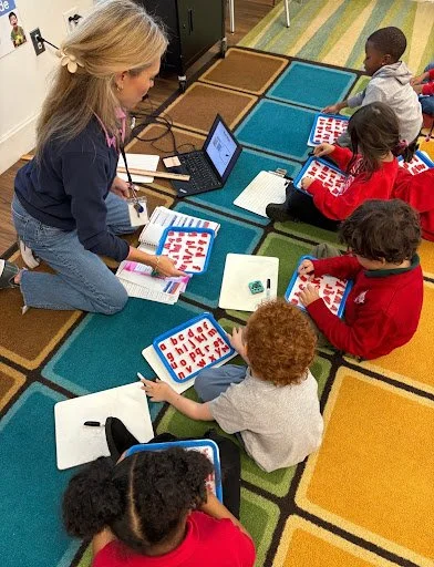Second-grade teacher Ms. Emily enthusiastically shared that her favorite part of UFLI is “Word Work!” During the seven-minute Word Work block, students use white boards or magnetic letters to build word chains using sounds and letters they have previously learned. For example, after building the word cat, students may be asked to add a letter to turn the word cat into chat. Then, they may be asked to change the c to a t and read the new word, that. This part of the curriculum keeps both students and teachers on their feet as they move fluidly between encoding and decoding and read and compose more than ten words in a short amount of time.