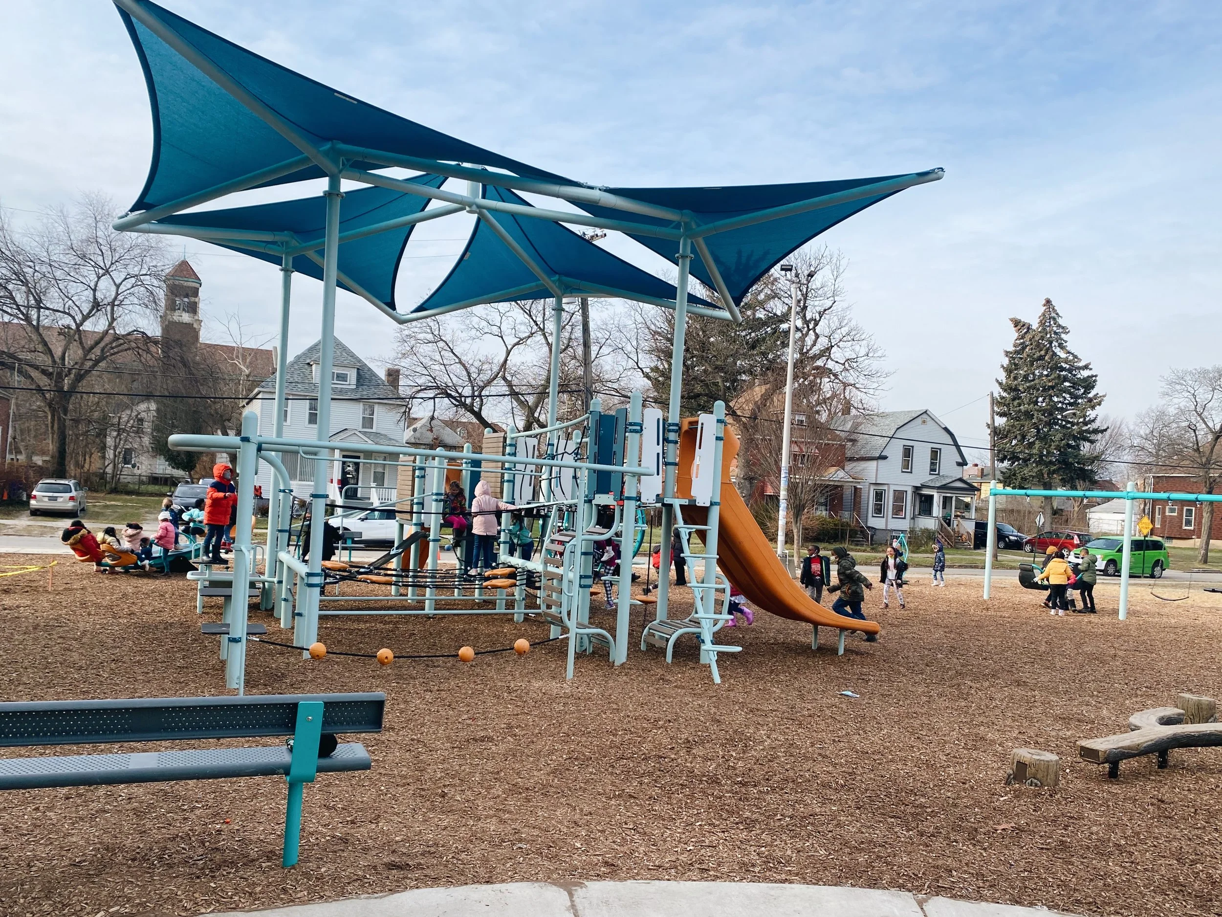 It has so many fun elements for our students and neighbors to play on, including a slide, monkey bars, a rock climbing wall, a we-saw, sun shade, and more. It’s big, beautiful, and inclusive!